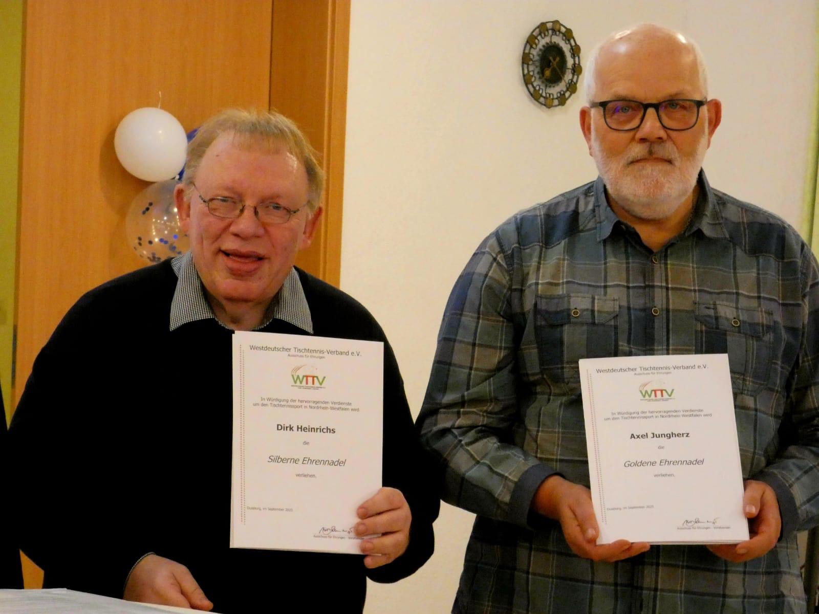 Nach kurzer Begrüßung der Gäste durch den 1. Vorsitzenden Dirk Heinrichs, sprachen Bürgermeister Ingo Eßer und der Bezirksvorsitzende des Tischtennisbezirks Aachen/Euregio kurze Grußworte. Dirk Heinrichs wurde anschließend durch Herrn Wallis mit der silbernen Ehrennadel des WTTV ausgezeichnet. Axel Jungherz und Walter Stollenwerk (leider verhindert) als Urgesteine des Vorstandes erhielten diese Auszeichnung sogar in Gold.