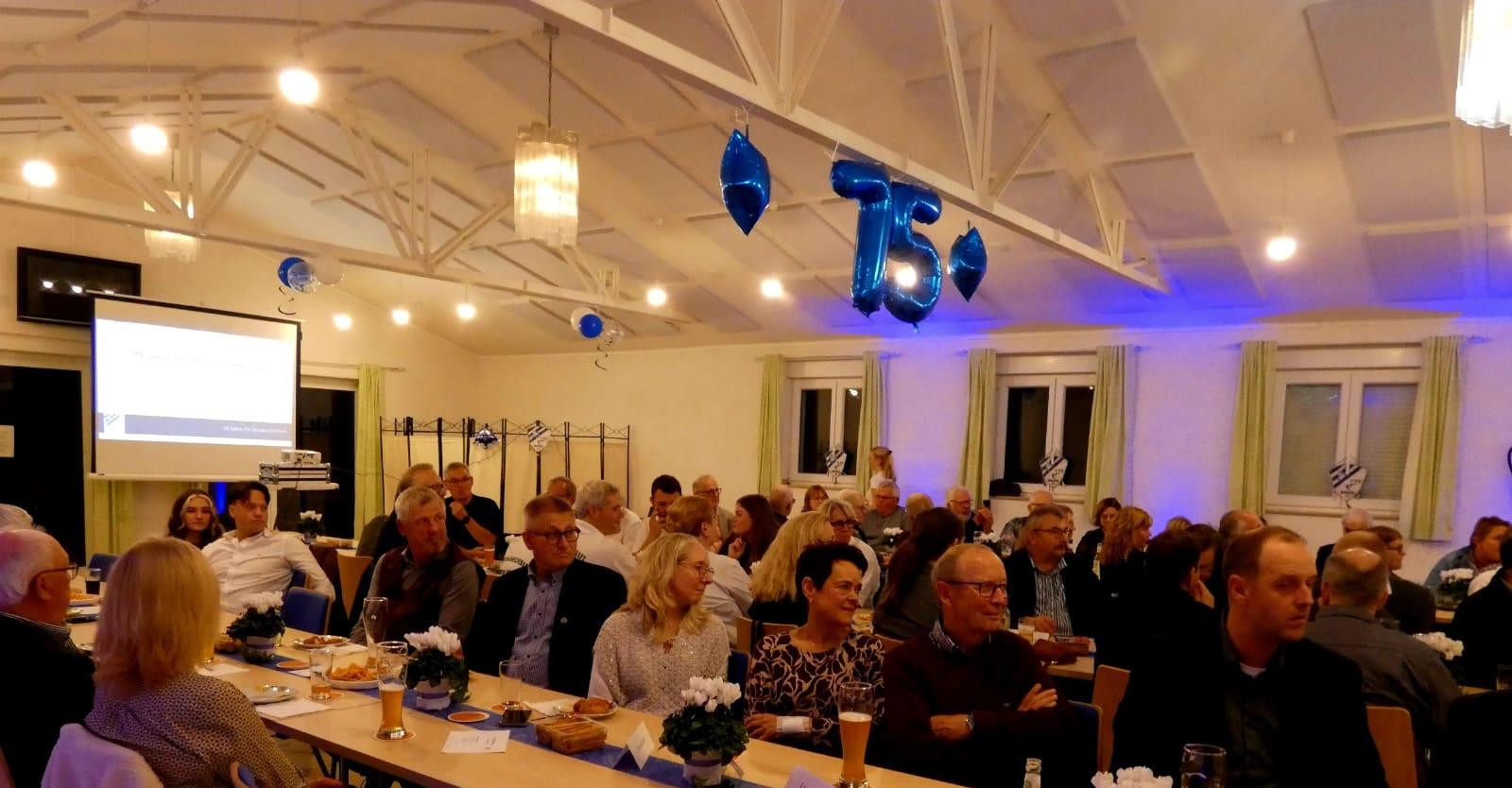 Höhepunkt des Abends war die anschließende kurzweilige pointierte Präsentation der 75-jährigen Vereinshistorie durch Dirk Heinrichs und Ludwig Bonn.  So mancher Besucher begann schon während des Vortrags in Erinnerungen und Anekdoten zu schwelgen und gemeinsam wurde dies bei kühlen Getränken und Fingerfood bis in die Morgenstunden fortgesetzt.